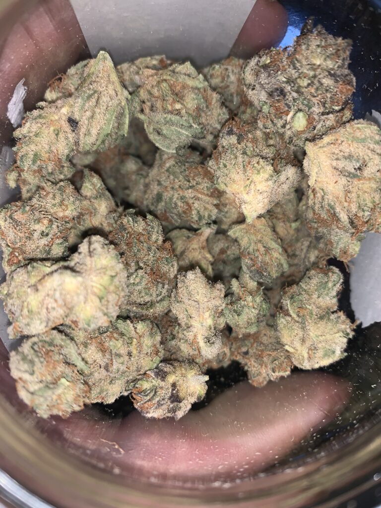 “Lime green & purple little nuggets which are a tasty floral bouquet for this little number that drives euphoria with a 22.49% THC rating.“